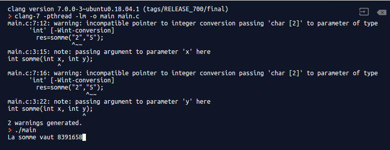 Évidemment le compilateur a pu informer le programmeur du problème parce que le prototype de la fonction précise que les paramètres attendus sont des entiers. Ce qui, au départ, aurait pu paraitre comme une contrainte inutile peut rendre de grand service au programmeur au cours du débogage du programme, alors qu'en Python, l'erreur pourrait passer inaperçue.