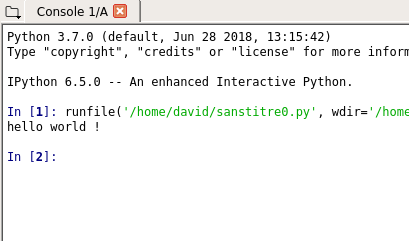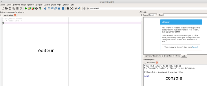 Spyder se divise en plusieurs fenêtres, deux fenêtres vont principalement nous intéresser : la fenêtre "éditeur" et la fenêtre "console".