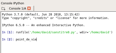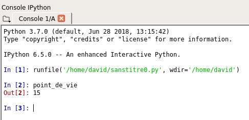 Après avoir exécuté le programme en cliquant sur le triangle vert, il est possible de connaitre la valeur de la variable point_de_vie en tapant le nom de la variable dans la "console" de Spyder.