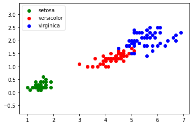 Nous obtenons des "nuages" de points, on remarque ces points sont regroupés par espèces d'iris (pour "iris virginica" et "iris versicolor", les points ont un peu tendance à se mélanger).