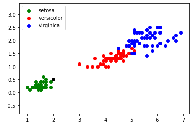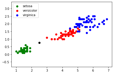 Imaginez maintenant qu'au cours d'une promenade vous trouviez un iris, n'étant pas un spécialiste, il ne vous est pas vraiment possible de déterminer l'espèce. En revanche, vous êtes capables de mesurer la longueur et la largeur des pétales de cet iris. Partons du principe qu'un pétale fasse 0,5 cm de large et 2 cm de long. Plaçons cette nouvelle donnée sur notre graphique (point en noir) :