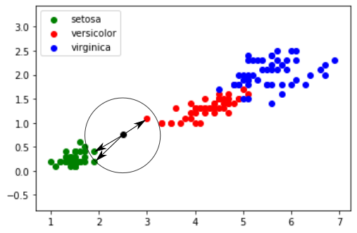 Les 3 plus proches voisins sont signalés ci-dessus avec des flèches : nous avons deux "iris setosa" (point vert) et un "iris versicolor" (point rouge). D'après l'algorithme des "k plus proches voisins", notre "iris mystère" appartient à l'espèce "setosa".