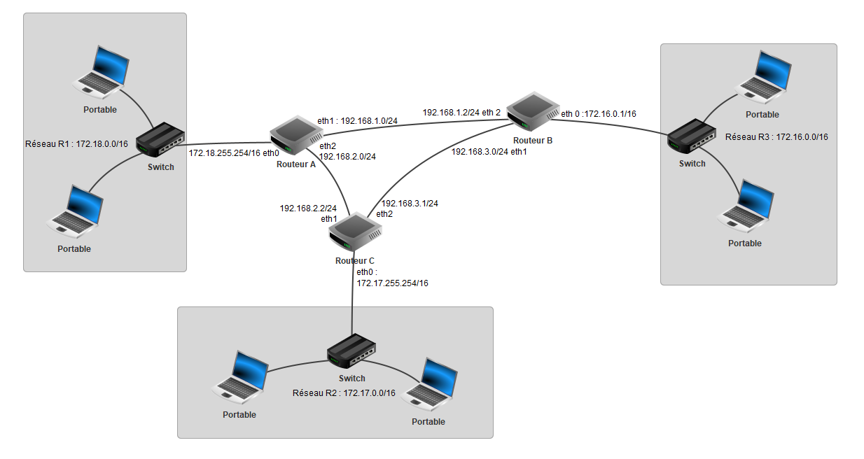 - le routeur A qui possède 3 interfaces réseau que l'on nomme eth0, eth1 et eth2. Les adresses IP liées à ces interfaces réseau sont : 172.168.255.254/16 (eth0), 172.169.255.254/16 (eth2) et 192.168.7.1/24 (eth1)