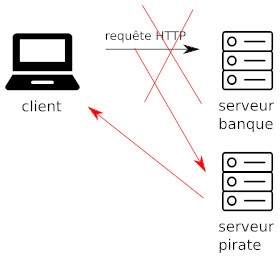 grâce à une technique qui ne sera pas détaillée ici (le DNS spoofing), un serveur "pirate" peut se faire passer pour un site sur lequel vous avez l'habitude de vous rendre en toute confiance : imaginez vous voulez consulter vos comptes bancaires en ligne, vous saisissez l'adresse web de votre banque dans la barre d'adresse de votre navigateur favori, vous arrivez sur la page d'accueil d'un site en tout point identique au site de votre banque, en toute confiance, vous saisissez votre identifiant et votre mot de passe. C'est terminé un "pirate" va pouvoir récupérer votre identifiant et votre mot de passe ! Pourquoi ? Vous avez saisi l'adresse web de votre banque comme d'habitude ! Oui, sauf que grâce à une attaque de type "DNS spoofing" vous avez été redirigé vers un site pirate, en tout point identique au site de votre banque. Dès vos identifiant et mot de passe saisis sur ce faux site, le pirate pourra les récupérer et se rendre avec sur le véritable site de votre banque. À noter qu'il existe d'autres techniques que le DNS spoofing qui permettent de substituer un serveur à un autre, mais elles ne seront pas évoquées ici.