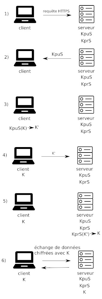 le client "fabrique" une clé K (qui sera utilisé pour chiffrer les futurs échanges), chiffre cette clé K avec KpuS et envoie la version chiffrée de la clé K au serveur