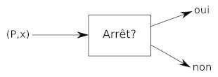 Soit un programme (ou un algorithme, cela revient au même) que l'on va nommer "Arrêt?", ce programme prend en entrée un programme P et des données x (les données x sont les données qui vont être utilisées par le programme P). Le programme "Arrêt?" répond "oui" si le programme P (qui utilise les données x) s'arrête. Le programme "Arrêt?" répond "non" si le programme P (qui utilise les données x) ne s'arrête jamais.