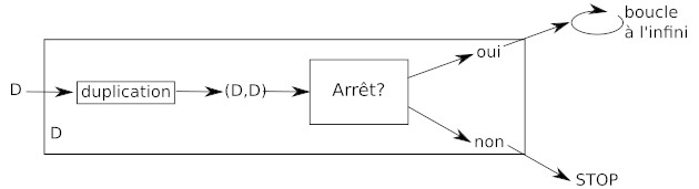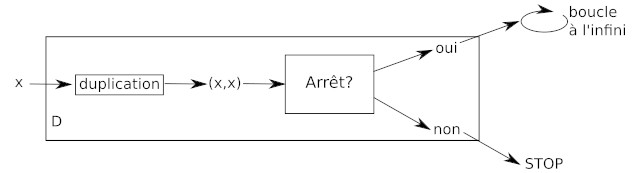 supposons que D s'arrête quand on lui donne D => "Arrêt?" répond "OUI", donc D tombe dans une boucle infinie, donc D ne s'arrête pas. Donc quand D s'arrête, D ne s'arrête pas... ce qui est une contradiction