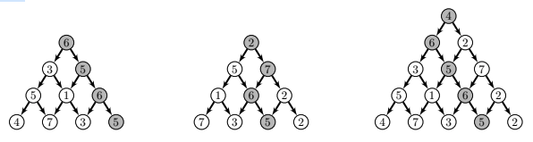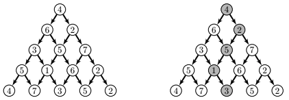 Nolan vient de découvrir un petit jeu amusant dont le but est de trouver un chemin de score maximal dans une pyramide de nombres. Un exemple de pyramide de nombres est représenté ci-dessous. Un chemin dans cette pyramide doit partir du sommet de la pyramide et descendre jusqu’en bas en suivant des flèches, c’est-à-dire en choisissant à chaque niveau de descendre sur la droite ou sur la gauche. Le score d’un chemin est la somme des nombres rencontrés le long de ce chemin. Le chemin gris représenté sur la pyramide de droite a pour score 4 + 2 + 5 + 1 + 3 = 15.