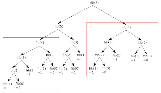 La programmation dynamique s'applique quand les sous-problèmes se recoupent, c'est-à-dire lorsque les sous-problèmes ont des problèmes communs (dans le cas du calcul de fib(6) on doit calculer 2 fois fib(4). Pour calculer fib(4), on doit calculer 4 fois fib(2)...). Un algorithme de programmation dynamique résout chaque sous-problème une seule fois et mémorise sa réponse dans un tableau, évitant ainsi le recalcule de la solution chaque fois qu'il résout chaque sous-problème.