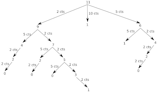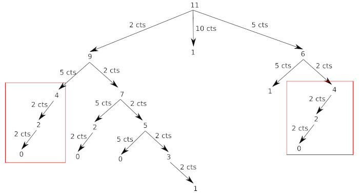 Comme vous avez peut-être déjà dû le remarquer, même dans le cas simple évoqué ci-dessus (11 cts à rendre), nous faisons plusieurs fois exactement le même calcul. Par exemple on retrouve 2 fois la branche qui part de "4" :