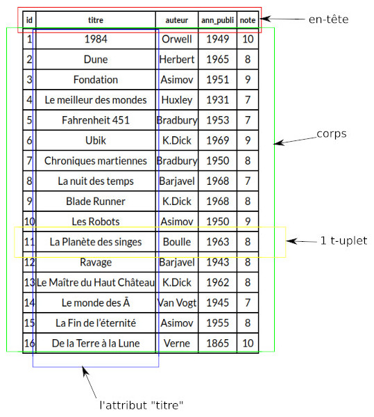 Le t-uplet encadré en jaune sur le schéma ci-dessus contient les éléments suivant : 11, La Planète des singes, Boulle, 1963 et 8. L'attribut "titre" est composé des éléments suivants : 1984, Dune, Fondation, Le meilleur des mondes, Fahrenheit 451, Ubik, Chroniques martiennes, La nuit des temps, Blade Runner, Les Robots, La Planète des singes, Ravage, Le Maître du Haut Château, Le monde des Ā, La Fin de l’éternité et De la Terre à la Lune.