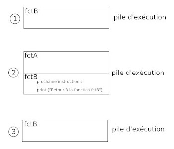 - la fonction fctB s'exécute jusqu'à l'appel de la fonction fctA