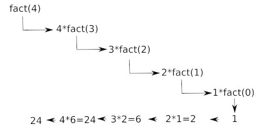 On a fact(4) = 4 * fact(3) avec fact(3) = 3 * fact(2) avec fact(2) = 2 * fact(1) avec fact(1) = 1 * fact(0) avec fact(0) = 1 (par définition) donc fact(1) = 1 donc fact(2) = 2 donc fact(3) = 6 donc fact(4) = 24