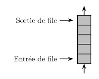 - enfile(F,42) la file F est maintenant composée des éléments suivants : 42, 12, 14, 8, 7, 19 et 22 (le premier élément rentré dans la file est 22 ; le dernier élément rentré dans la file est 42)