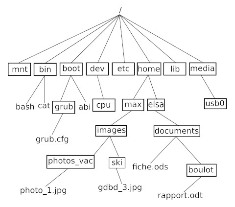 Dernier exemple, les systèmes de fichiers dans les systèmes de type UNIX ont aussi une structure en arbre (notion vue l'année dernière)