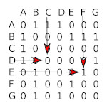 Il faut savoir qu'à chaque ligne correspond un sommet du graphe et qu'à chaque colonne correspond aussi un sommet du graphe. À chaque intersection ligne i-colonne j (ligne i correspond au sommet i et colonne j correspond au sommet j), on place un 1 s'il existe une arête entre le sommet i et le sommet j, et un zéro s'il n'existe pas d'arête entre le sommet i et le sommet j.